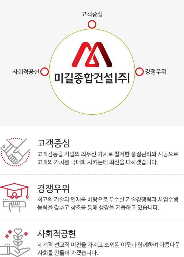 미길종합건설은 최고의 기술과 인재를 바탕으로 정직한 경영으로 고객중심, 경쟁우위, 사회적공헌의 아름다운 기업을 만들어 가겠습니다.